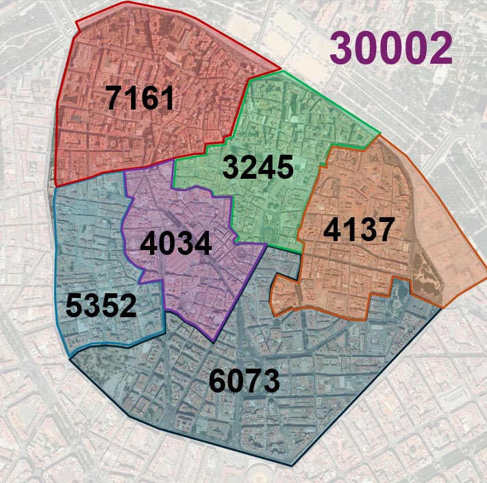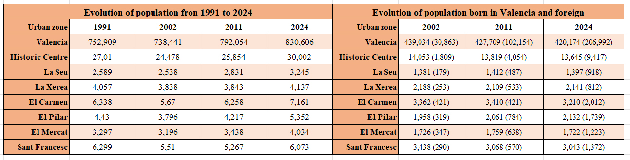 According to the most recent census, carried out in December 2024, Valencia has a population of 830,606 inhabitants (Table 1). The municipality covers a surface area of 55 km2, equivalent to a density of 15,000 inhab/km2, if the districts of Huerta Sur, Norte and Oeste are excluded. As these are the largest districts, with scattered housing, they would alter the interpretation of data for the city centre. The nucleus of the historic centre, with 30,002 inhabitants, has a slightly higher density, with 17,752 inhab/km2. Although there is no consensus on the advisable range for an optimum population density, it could be said to currently vary between 12,000 inhab/km2 and 35,000 hab/km2.