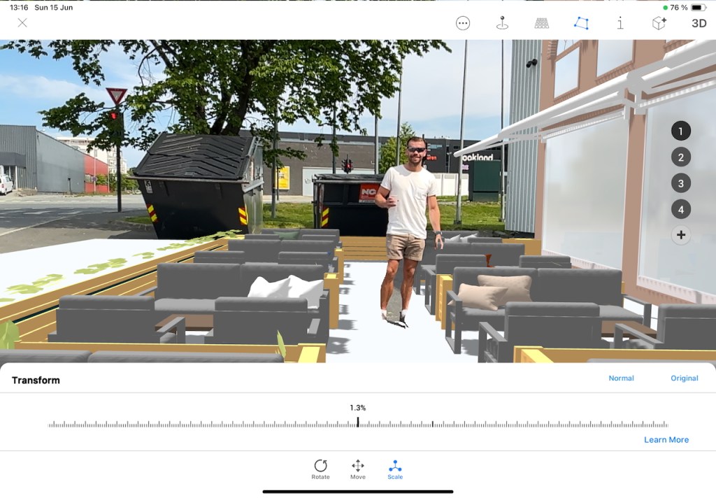 The team selected a building façade along Haakon VII Street to explore its transformation into a vibrant street-front retail space, such as a café, restaurant, or shop, with extended outdoor seating and furniture. Several alternative façade designs were developed and embedded in AR. Participants experienced the changes in full scale at the site and provided feedback on: