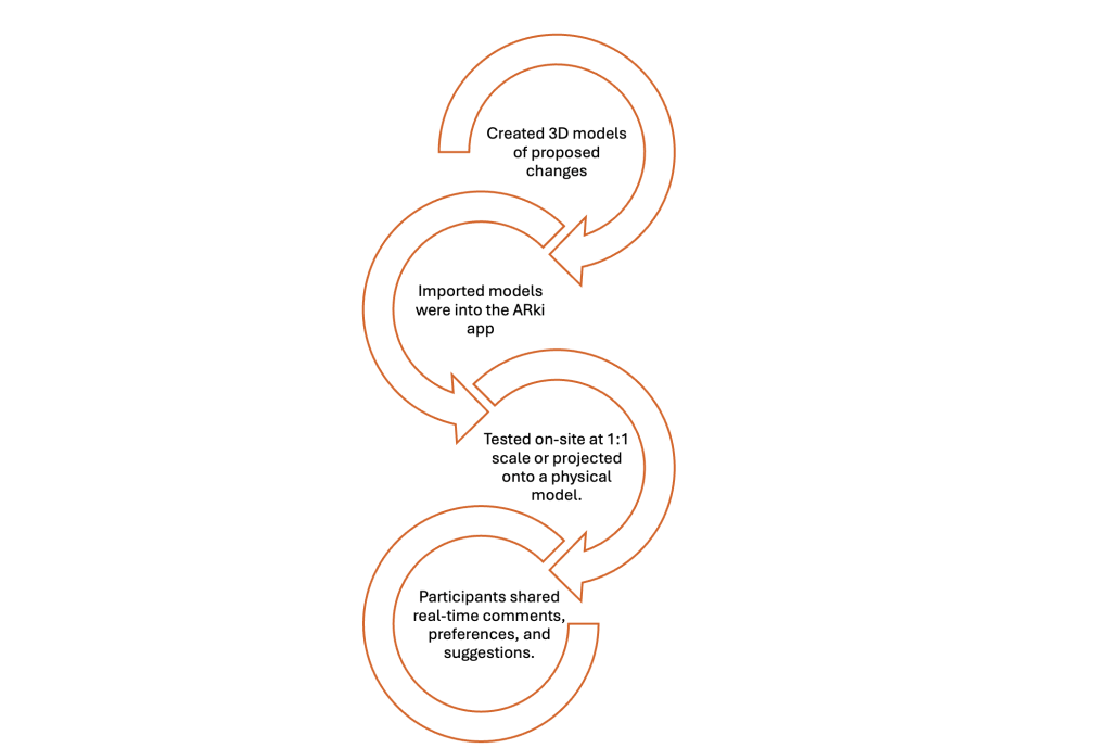 Augmented Reality (AR) offers an innovative way to visualize complex ideas and environments, helping participants gain a deeper understanding of the living environment and proposed interventions. By overlaying digital elements onto real-world settings, AR makes it easier for people to see changes in context, fostering better involvement and active participation in urban development processes.